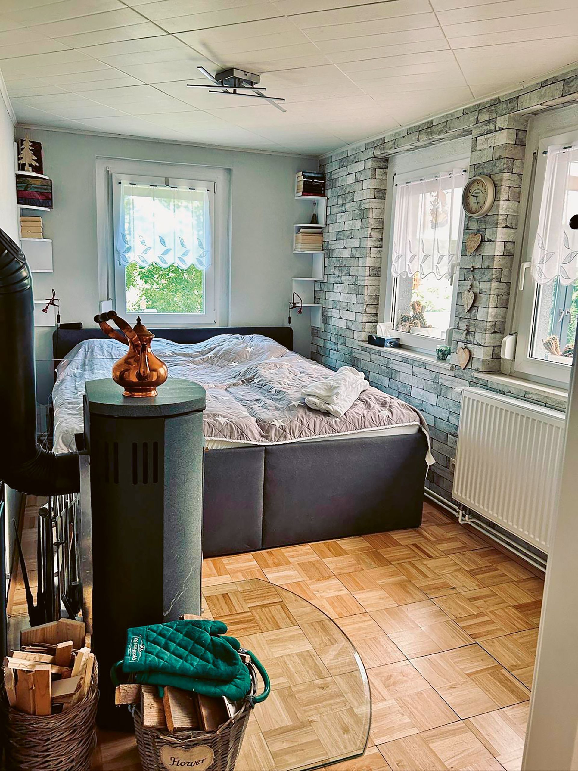 Schlafzimmer 1: Kingsize-Bett (1,80m x 2,00m), Kommode, TV, Kaminofen (kleiner Holzvorrat inklusive)