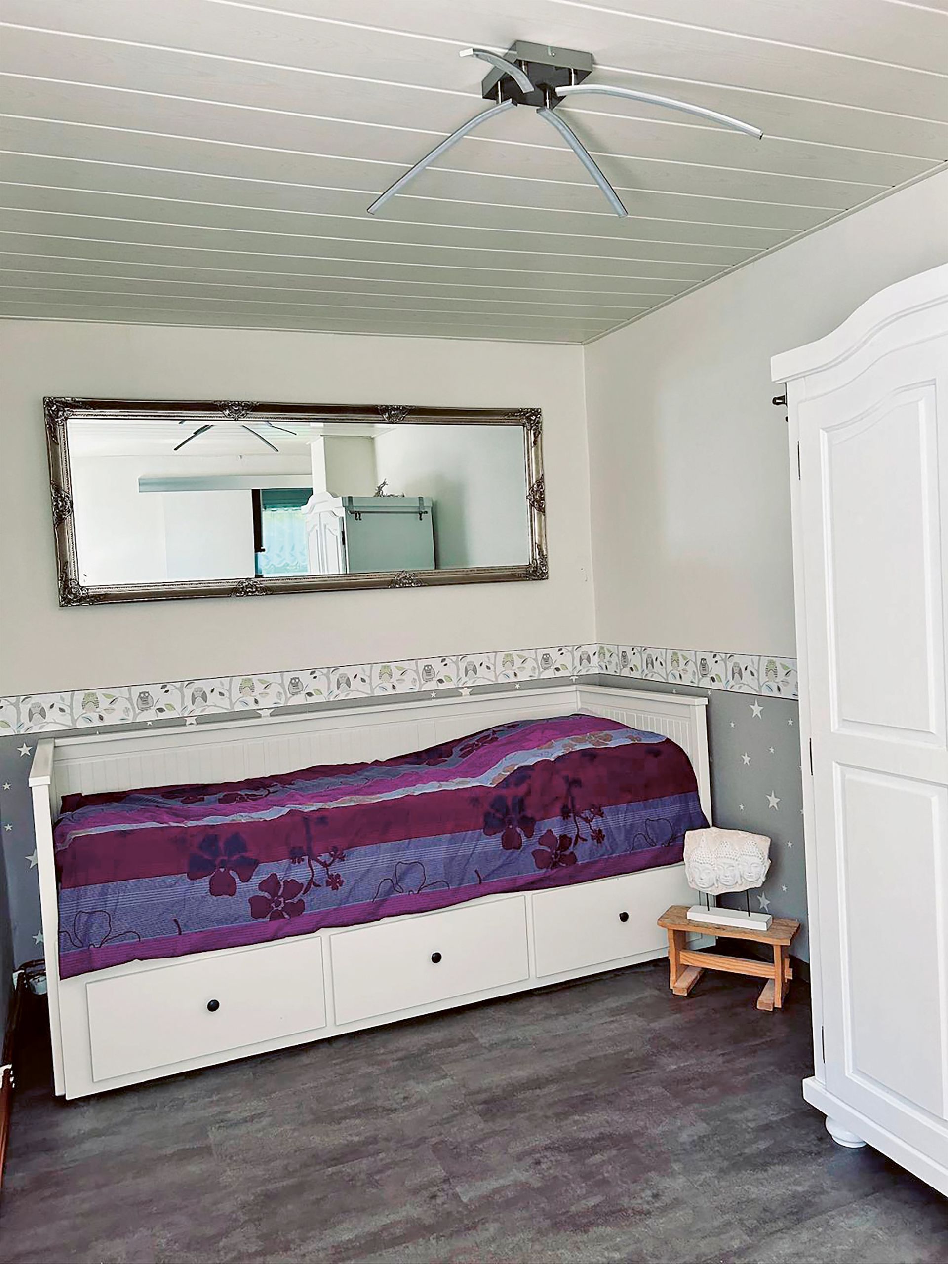 Schlafzimmer 2: Queensize-Bett (1,60 x 2,00m, ausziehbar), Kleiderschrank, Kommode, Sitzgelegenheit